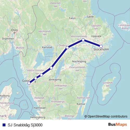 The first stop of the SJ Snabbtåg Sj3000 rail route is Stockholm Centralstation and the last stop is Göteborg Centralstation. SJ Snabbtåg Sj3000 (SJ Snabbtåg Sj3000) is operational during on weekends.