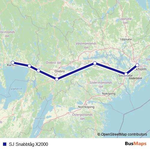 The first stop of the SJ Snabbtåg X2000 rail route is Stockholm Centralstation and the last stop is Karlstad Centralstation. SJ Snabbtåg X2000 (SJ Snabbtåg X2000) is operational during everyday.