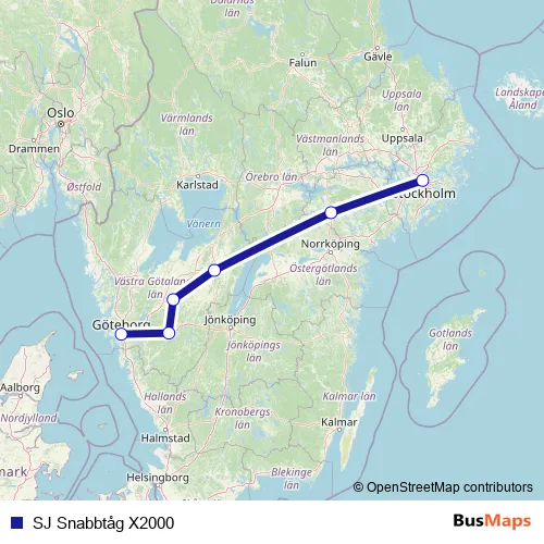 The first stop of the SJ Snabbtåg X2000 rail route is Stockholm Centralstation and the last stop is Göteborg Centralstation. SJ Snabbtåg X2000 (SJ Snabbtåg X2000) is operational during everyday.