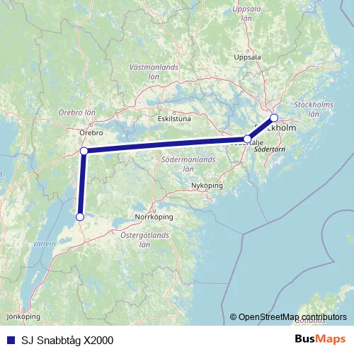 The first stop of the SJ Snabbtåg X2000 rail route is Motala station and the last stop is Stockholm Centralstation. SJ Snabbtåg X2000 (SJ Snabbtåg X2000) is operational during on weekends.