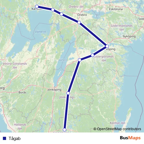 The first stop of the Tågab rail route is Alvesta station and the last stop is Karlstad Centralstation. Tågab is operational during everyday.
