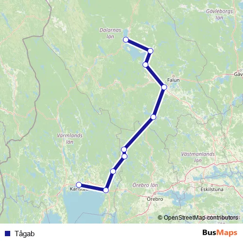 The first stop of the Tågab rail route is Mora station and the last stop is Kristinehamn station. Tågab is operational during everyday.