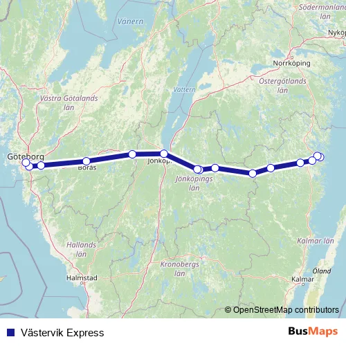 The first stop of the Västervik Express bus route is Västervik station and the last stop is Göteborg Nils Ericsonterminal. Västervik Express (Västervik Express) is operational during everyday.