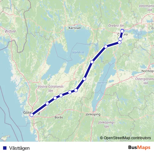 The first stop of the Västtågen rail route is Örebro Centralstation and the last stop is