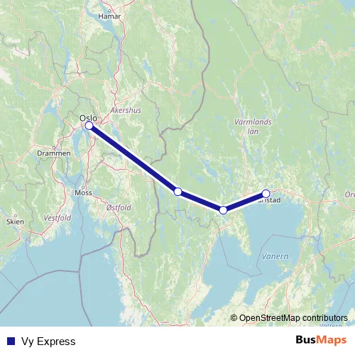 The first stop of the Vy Express bus route is Oslo Bussterminal and the last stop is Karlstad busstation. Vy Express is operational during on weekends.
