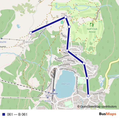 The first stop of the 061 bus route is Arosa, Prätschli and the last stop is Arosa, Bahnhof. 061 (B 061) is operational during everyday.