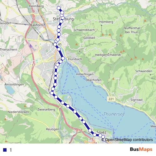 The first stop of the 1 bus route is Spiez, Bahnhof and the last stop is Steffisburg, Flühli. 1 is operational during everyday.