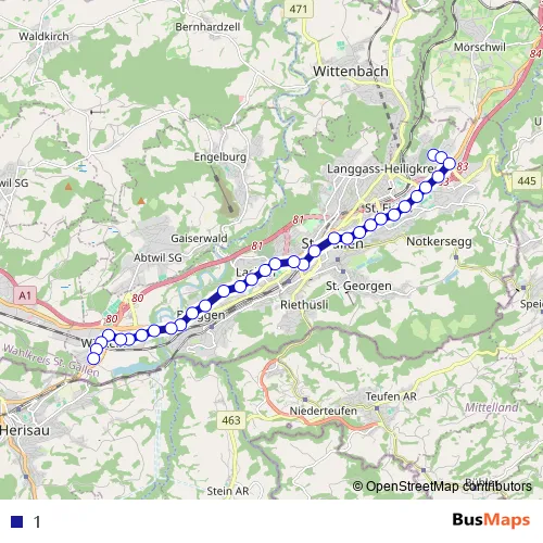 See why over 2 million users trust and consider busmaps.com as the best public transport website. busmaps gives you Sankt Gallen Buses suggested routes, real-time bus tracker, line route maps in Sankt Gallen, and helps to find the closest 1 bus stops near you. No internet available? Download an offline PDF map and bus schedule for the 1 bus to take on your trip.