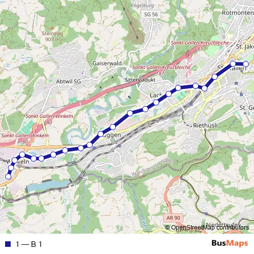 The first stop of the 1 bus route is St. Gallen, Theater and the last stop is St. Gallen, Winkeln. 1 (B 1) is operational during everyday.
