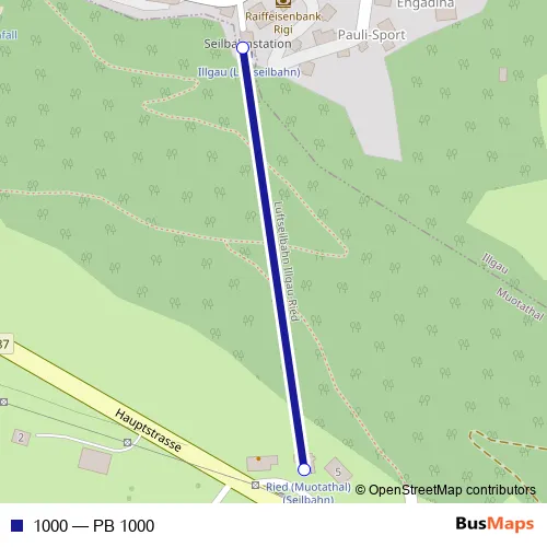 The first stop of the 1000 cable-car route is Ried (Muotathal) (Seilbahn) and the last stop is Illgau (Luftseilbahn). 1000 (PB 1000) is operational during everyday.
