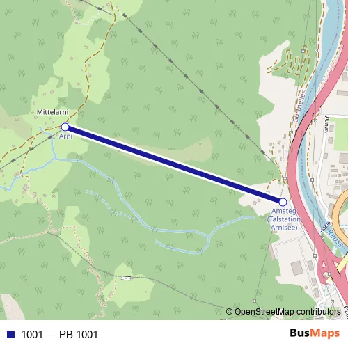 The first stop of the 1001 cable-car route is Arni Ur and the last stop is Amsteg (Talstation Arnisee). 1001 (PB 1001) is operational during everyday.