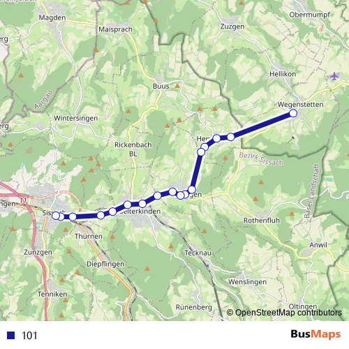 The first stop of the 101 bus route is Wegenstetten, Oberdorf and the last stop is Sissach, Bahnhof. 101 is operational during everyday.
