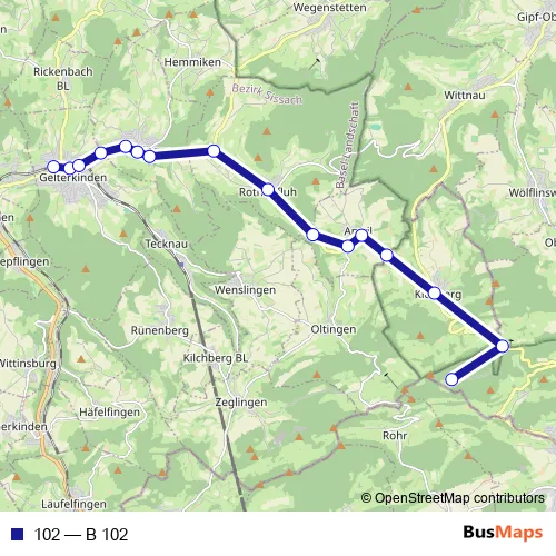 The first stop of the 102 bus route is Gelterkinden, Bahnhof and the last stop is Barmelweid. 102 (B 102) is operational during on weekends.