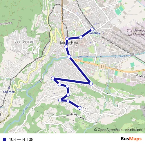 See why over 2 million users trust and consider busmaps.com as the best public transport website. busmaps gives you Monthey Buses suggested routes, real-time bus tracker, line route maps in Monthey, and helps to find the closest 108 bus stops near you. No internet available? Download an offline PDF map and bus schedule for the 108 bus to take on your trip.