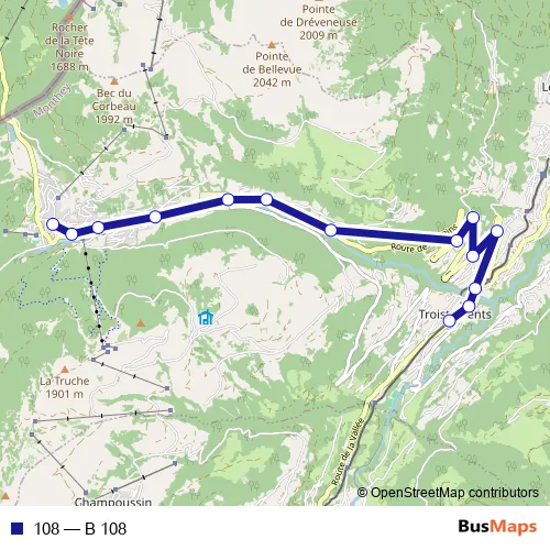 The first stop of the 108 bus route is Troistorrents, gare and the last stop is Morgins, école. 108 (B 108) is operational during everyday.