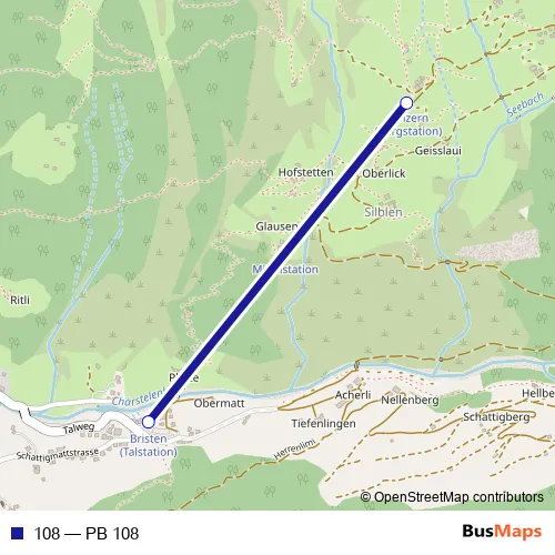 The first stop of the 108 cable-car route is Golzern (Bergstation) and the last stop is Bristen (Talstation). 108 (PB 108) is operational during on weekdays.