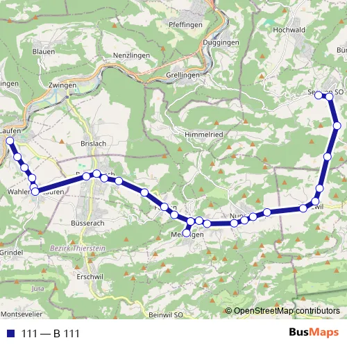 The first stop of the 111 bus route is Laufen, Bahnhof and the last stop is Seewen SO, Herrenmatt. 111 (B 111) is operational during everyday.