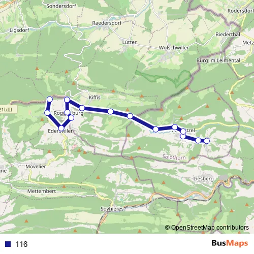 The first stop of the 116 bus route is Kleinlützel, Huggerwald and the last stop is Roggenburg, Neumühle. 116 is operational during everyday.