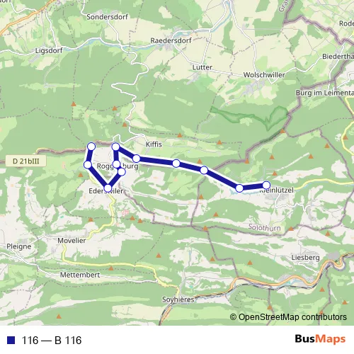 The first stop of the 116 bus route is Kleinlützel, Ölibächli and the last stop is Roggenburg, Neumühle. 116 (B 116) is operational during everyday.