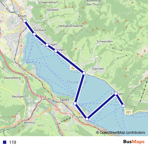 The first stop of the 119 ferry route is Thun (See) and the last stop is Beatenbucht (See). 119 is operational during everyday.