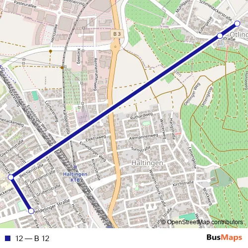 The first stop of the 12 bus route is Ötlingen (Baden), Dorfstrasse and the last stop is Haltingen, West. 12 (B 12) is operational during on weekdays.