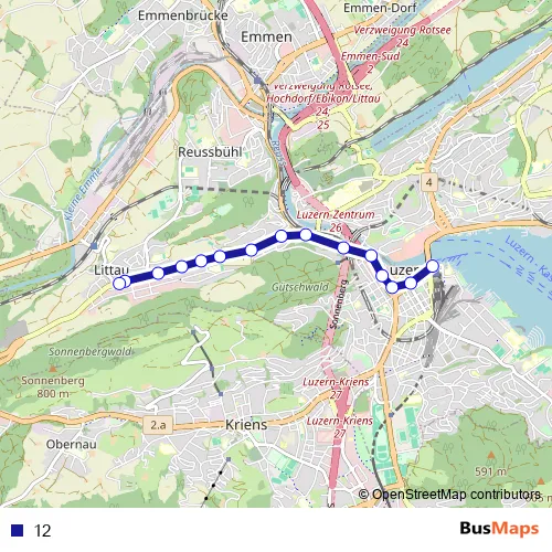 See why over 2 million users trust and consider busmaps.com as the best public transport website. busmaps gives you Luzern Buses suggested routes, real-time bus tracker, line route maps in Luzern, and helps to find the closest 12 bus stops near you. No internet available? Download an offline PDF map and bus schedule for the 12 bus to take on your trip.
