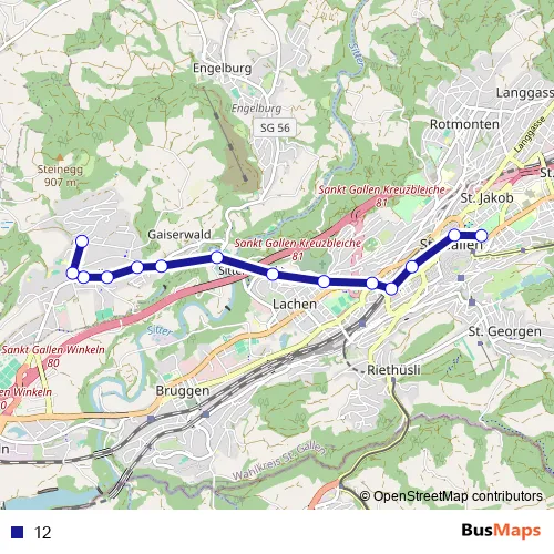 See why over 2 million users trust and consider busmaps.com as the best public transport website. busmaps gives you Sankt Gallen Buses suggested routes, real-time bus tracker, line route maps in Sankt Gallen, and helps to find the closest 12 bus stops near you. No internet available? Download an offline PDF map and bus schedule for the 12 bus to take on your trip.