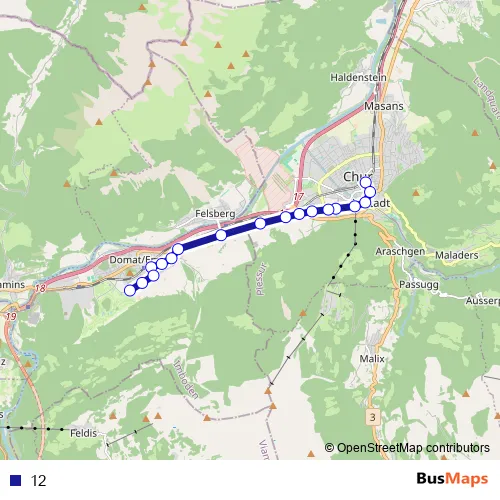 The first stop of the 12 bus route is Chur, Bahnhofplatz and the last stop is Domat/Ems, Marchesa. 12 is operational during on weekdays.
