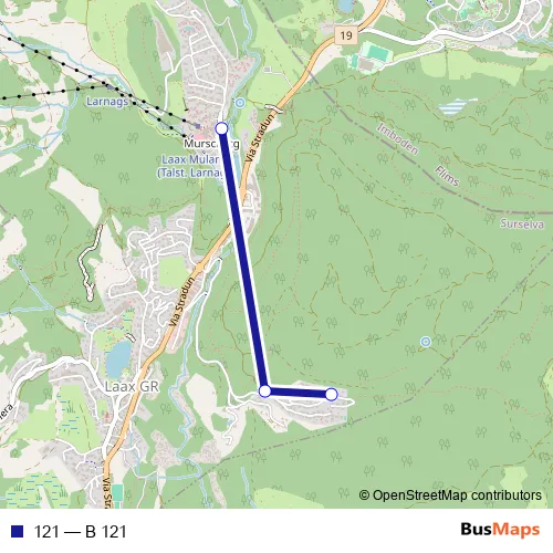 The first stop of the 121 bus route is Laax GR, Bergbahnen and the last stop is Laax GR, Salums sura. 121 (B 121) is operational during everyday.