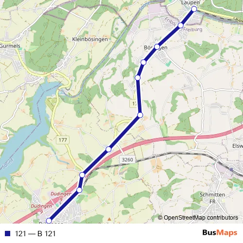 The first stop of the 121 bus route is Düdingen, Bahnhof and the last stop is Laupen BE, Bahnhof. 121 (B 121) is operational during everyday.