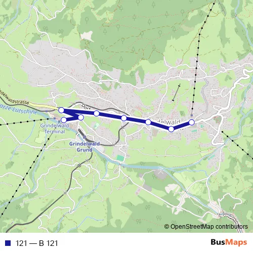 The first stop of the 121 bus route is Grindelwald, Terminal and the last stop is Grindelwald, Firstbahn. 121 (B 121) is operational during everyday.