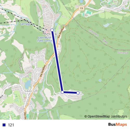 The first stop of the 121 bus route is Laax GR, Bergbahnen and the last stop is Laax GR, Salums sura. 121 is operational during everyday.