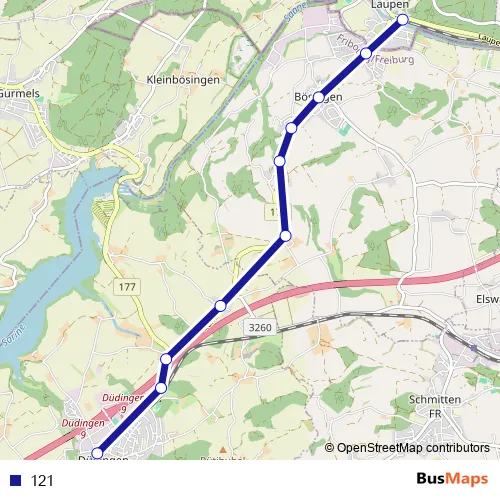 The first stop of the 121 bus route is Laupen BE, Bahnhof and the last stop is Düdingen, Bahnhof. 121 is operational during everyday.