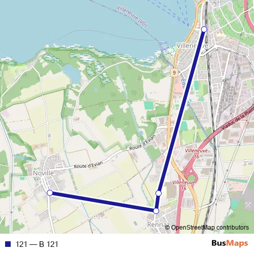 The first stop of the 121 bus route is Noville, Collège and the last stop is Villeneuve VD, gare. 121 (B 121) is operational during on weekdays.