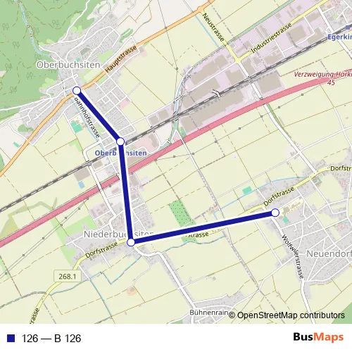 The first stop of the 126 bus route is Neuendorf, Schulhaus and the last stop is Oberbuchsiten, Löwen. 126 (B 126) is operational during on weekdays.