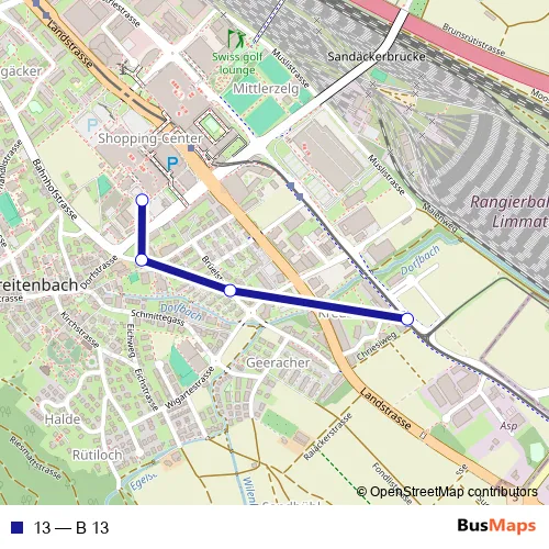 See why over 2 million users trust and consider busmaps.com as the best public transport website. busmaps gives you Spreitenbach Buses suggested routes, real-time bus tracker, line route maps in Spreitenbach, and helps to find the closest 13 bus stops near you. No internet available? Download an offline PDF map and bus schedule for the 13 bus to take on your trip.