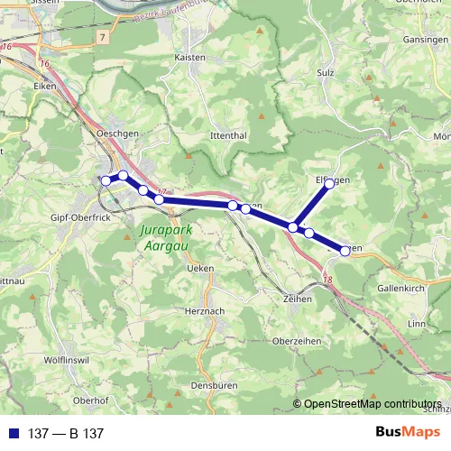 The first stop of the 137 bus route is Effingen, Dorf and the last stop is Frick, Bahnhof. 137 (B 137) is operational during everyday.