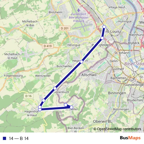 See why over 2 million users trust and consider busmaps.com as the best public transport website. busmaps gives you Basel Buses suggested routes, real-time bus tracker, line route maps in Basel, and helps to find the closest 14 bus stops near you. No internet available? Download an offline PDF map and bus schedule for the 14 bus to take on your trip.