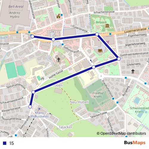 The first stop of the 15 bus route is Kriens, Pilatus-Bahnen and the last stop is Kriens, Busschleife. 15 is operational during everyday.
