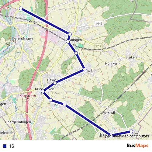 The first stop of the 16 bus route is Derendingen, Oberstufenzentrum and the last stop is Winistorf, Mösli. 16 is operational during on weekdays.