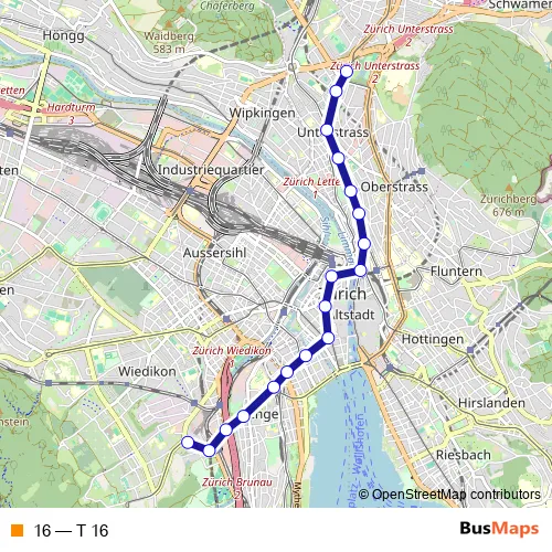 See why over 2 million users trust and consider busmaps.com as the best public transport website. busmaps gives you Zuerich Trams suggested routes, real-time bus tracker, line route maps in Zuerich, and helps to find the closest 16 tram stops near you. No internet available? Download an offline PDF map and bus schedule for the 16 tram to take on your trip.