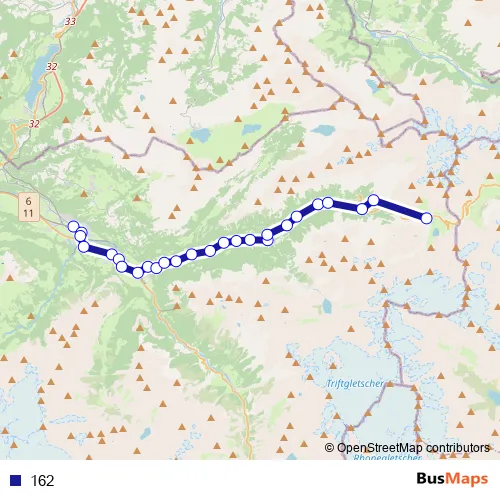 The first stop of the 162 bus route is Meiringen, Bahnhof and the last stop is Steingletscher, Susten. 162 is operational during everyday.