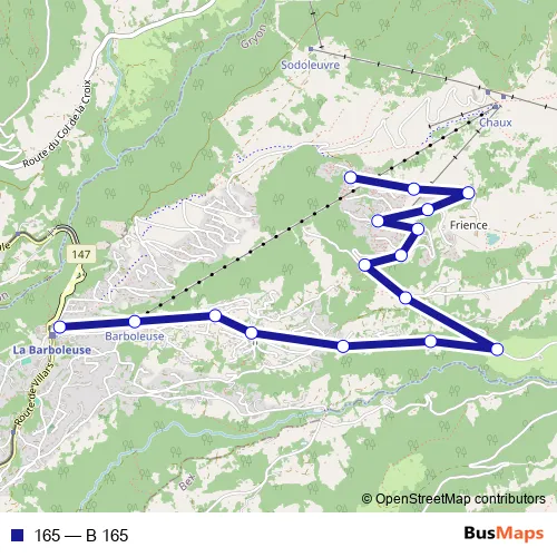 The first stop of the 165 bus route is Gryon Barboleuse, gare and the last stop is Alpe des Chaux, Combe du Scex. 165 (B 165) is operational during everyday.