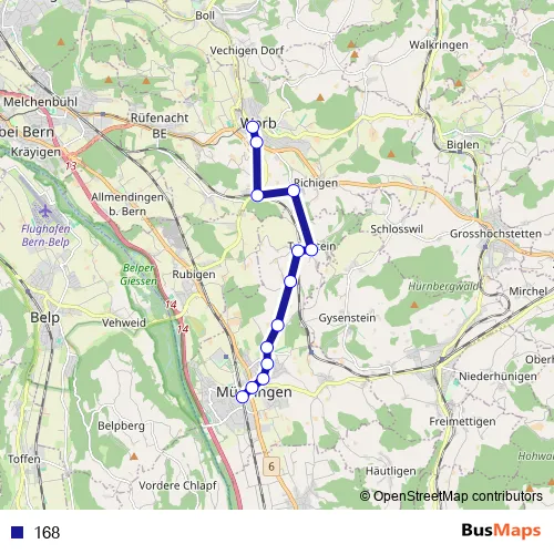 The first stop of the 168 bus route is Worb Dorf, Bahnhof and the last stop is Münsingen, Bahnhof. 168 is operational during on weekdays.