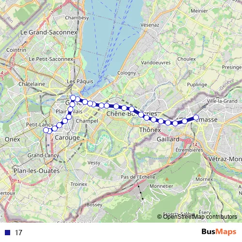 See why over 2 million users trust and consider busmaps.com as the best public transport website. busmaps gives you Geneve Trams suggested routes, real-time bus tracker, line route maps in Geneve, and helps to find the closest 17 tram stops near you. No internet available? Download an offline PDF map and bus schedule for the 17 tram to take on your trip.