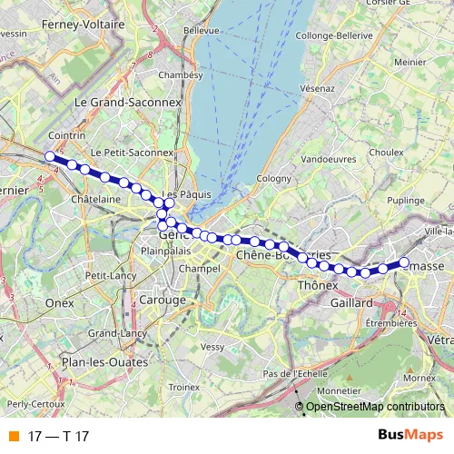 See why over 2 million users trust and consider busmaps.com as the best public transport website. busmaps gives you Geneve Trams suggested routes, real-time bus tracker, line route maps in Geneve, and helps to find the closest 17 tram stops near you. No internet available? Download an offline PDF map and bus schedule for the 17 tram to take on your trip.