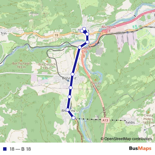 The first stop of the 18 bus route is Tamins, Unterdorf and the last stop is Rhäzüns, Luftseilbahn Lrf. 18 (B 18) is operational during everyday.