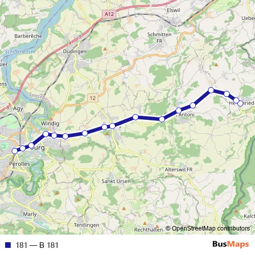 The first stop of the 181 bus route is Heitenried, Dorf and the last stop is Fribourg/Freiburg, gare rout.. 181 (B 181) is operational during on weekdays.
