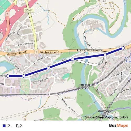 The first stop of the 2 bus route is St. Gallen, Mövenstrasse and the last stop is St. Gallen, Fürstenlandbrücke. 2 (B 2) is operational during everyday.