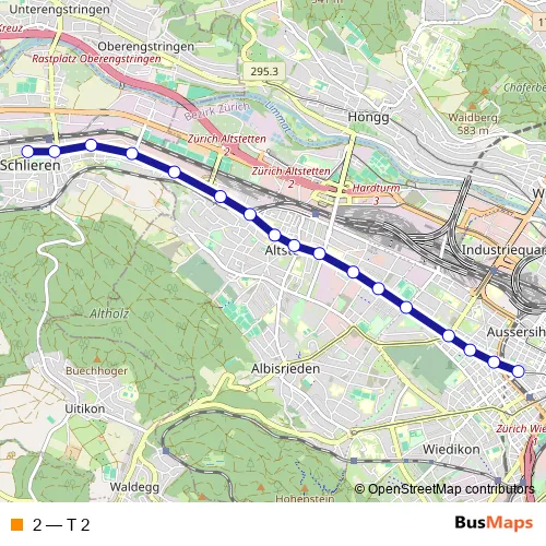 The first stop of the 2 tram route is Schlieren, Geissweid and the last stop is Zürich,Kalkbreite/Bhf.Wiedikon. 2 (T 2) is operational during everyday.